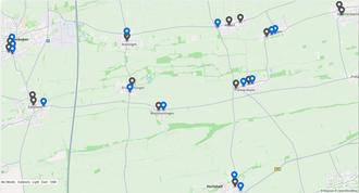 Das Bediengebiet der VRNflexline im Gäu. Bedient werden sowohl reguläre Bushaltestellen (hier grau markiert) als auch zusätzliche Haltepunkte, sogenannte virtuelle Haltestellen (hier blau markiert).