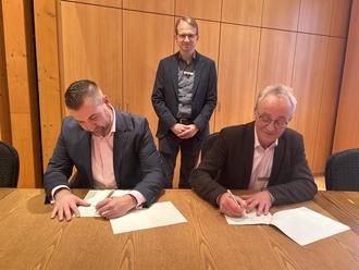 von links: Chef der Staatskanzlei, Staatssekretär Fedor Ruhose und Erster Beigeordneter Eberhard Frankmann bei der Unterzeichnung der Vereinbarung zur Einführung der Ehrenamtskarte mit Bürgermeister Daniel Salm.