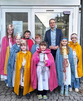 Am Donnerstag, 15. Januar besuchten acht Sternsinger aus Altdorf die Verbandsgemeindeverwaltung Edenkoben. Gemeinsam mit den Betreuerinnen, darunter die Erste Beigeordnete Vienna Grüner, brachten die Kinder den Segen in die Verwaltung – eine schöne Tradition. Bürgermeister Daniel Salm begrüßte die Gäste mit großer Freude und dankte den Sternsingern und ihren Betreuerinnen für ihren ehrenamtlichen Einsatz für Kinder, denen es nicht so gut geht. Zum Dank überreichte der Bürgermeister Gutscheine für das Freibad Edesheim und eine Geldspende zur Unterstützung der Aktion.