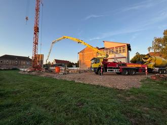 Schritt für Schritt geht es Richtung Erweiterung der Grundschule Edesheim – unter den wachsamen Augen der 182 Schülerinnen und Schüler und des Kollegiums um Leiterin Corina Ritter. Nach dem Start der Baumaßnahmen im Juni wurde am Samstag, 20. September 2025 ein Meilenstein erreicht: Die Betonbodenplatte des Erdgeschosses ist fertiggestellt. Auf dieser Grundlage geht es nun Richtung Hochbau.