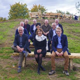 oben von links: Landrat Dietmar Seefeldt, Beigeordneter Daniel Poth, Projektleiter Bernhard Bäcker, Achim Seiler, Mitglied des Vorstandes der Sparkasse Südpfalz; Mitte von links: Ortsbürgermeister Peter Henrich, Regionalmarktleiterin VR Bank Südpfalz Sabine Heil, ehemaliger Bürgermeister Olaf Gouasé; Vorne von links: Erster Beigeordneter Eberhard Frankmann, Grafikdesignerin Michaela Wappler-Dorst und Bürgermeister Daniel Salm.