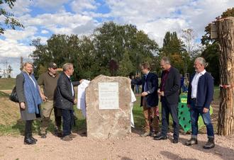 Enthüllung des Sandsteins: von links: Manuela Pfeffer und Bernhard Bäcker vom Fachbereich Bauen und Umwelt der Verbandsgemeinde Edenkoben, ehemaliger Bürgermeister Olaf Gouasé, Bürgermeister Daniel Salm, Landrat Dietmar Seefeldt und Ortsbürgermeister Peter Henrich