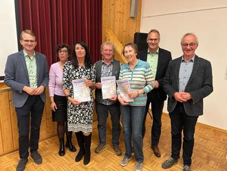 Ehrungen der Gästeführerinnen und Gästeführer: von links Bürgermeister Daniel Salm, Sabine Zwick, Geschäftsführerin des Vereins SÜW, Martina Roth, Gerd Hörner, Eva Bauer, Landrat Dietmar Seefeldt und Erster Beigeordneter Eberhard Frankmann.