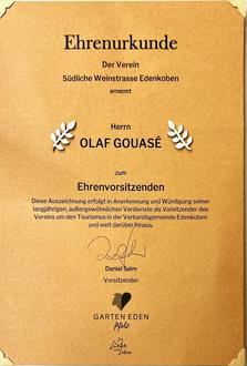 Von 1994 bis 2022 war Olaf Gouasé Vorsitzender des Vereins SÜW Edenkoben – mit 460 Mitgliedern der Größte im Landkreis Südliche Weinstraße. 28 Jahre lang habe sich der Bürgermeister, der Kraft Amtes Vorsitzender des Vereins ist, mit dem Tourismus im Garten Eden identifiziert. Das „Lebensgefühl an der Südlichen Weinstraße“ sei dem ehemaligen Bürgermeister ein Herzensanliegen gewesen, startete Landrat Dietmar Seefeldt seine Laudatio. Zurückblickend haben sich immer wieder die Themen Kunst und Kultur, Natur und Naturschutz wiedergefunden, etwa im Skulpturenweg, bei den Blühenden Landschaften, bei der Sonderausstellung zum 40. Geburtstag des Vereins Südliche Weinstrasse Edenkoben, die Nachhaltigkeitszertifizierung des Tourismusbüros. Weitere Stationen: Freibadsanierung, kurzzeitige Fusion mit der Verbandsgemeinde Maikammer, Barrierefreiheit, Arbeitsgruppengründung inmitten der Pandemie oder der Strategieprozess, das nachhaltige Reiseziel, Homeoffice und VG-übergreifende Teambildung, das inmitten der Pandemie online weiter zusammen arbeiten konnte.