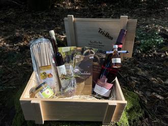 Die Keschde-Genussbox wird in zwei Verpackungsvarianten angeboten, zum einen im klassischen Karton "Südliche Weinstraße - Genussbox" und zum anderen in der hochwertigen Holzkiste aus regionalem Kastanienholz aus Annweiler am Trifels.