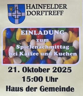 Am Dienstag, den 21. Oktober um 15 Uhr lädt das Team vom Hainfelder Dorftreff herzlich ins Haus der Gemeinde zum nächsten Hainfelder Dorftreff ein.