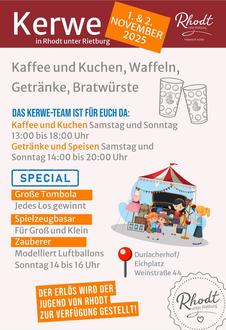 Kerwe-Café Samstag und Sonntag 13.00 bis 18.00 Uhr und eine Tombola für Groß und Klein (jedes Los gewinnt). Spielzeugbasar im Jugendzentrum Samstag und Sonntag 13.00 bis 18.00 Uhr. Der Zauberer kommt. Sonntag 14.00-16.00 Uhr. Am Samstag veranstaltet die Landjugend diese Jahr KEINE Kerwebar im Gewölbekeller. Der Erlös der Rhodter Kerwe wird gespendet und dient zur Finanzierung der Rhodter Kinder- und Jugendarbeit.