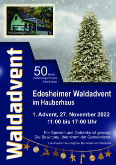 Die Ortsgemeinde Edesheim gratuliert der Verbandsgemeinde Edenkoben am ersten Advent mit einer ganz besonderen Veranstaltung im Hauberhaus. Dort wird am 27. November von 11 bis 17 Uhr der erste Waldadvent gefeiert. Seit 2020 ist die Gemeinde im Besitz des Waldhauses, das von Edesheimer Vereinen, den Kindertagesstätten und der Grundschule genutzt werden kann, um den „Wald“ bewusst zu erleben.