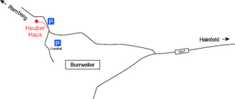 Das Hauberhaus liegt im Edesheimer Vorderwald und ist vom Parkplatz am Friedhof in Burrweiler in Richtung Annahütte zu Fuß in fünf Minuten zu erreichen.