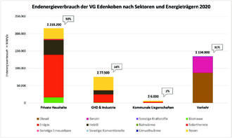 Die privaten Haushalte verursachen den größten Energieverbrauch mit etwa 218.200 MWh. Hier besteht vor allem im stationären Bereich, insbesondere im Einsparpotenzial der fossilen Wärmeversorgung, dringendster Handlungsbedarf. Die zweitgrößte Verbrauchergruppe ist der Verkehrssektor mit einem berechneten Verbrauch von rund 134.800 MWh. Der Wirtschaftssektor (Industrie & GHD) zeigt einen Energieverbrauch von etwa 77.500 MWh. Die kommunalen Liegenschaften bilden mit einem Energieverbrauch von etwa 6.000 MWh die kleinste Verbrauchergruppe.