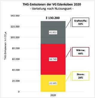 Auf Grundlage der Energiebilanz werden die jeweiligen THG-Emissionen ermittelt, wobei der spezifische Emissionsfaktor je eingesetztem Energieträger berücksichtigt wird. In dieser Bilanz wurden die THG-Emissionen in den Sektoren Strom, Wärme und Verkehr für die verschiedenen Verbrauchssektoren anhand der zuvor erläuterten Verbräuche quantifiziert. Im Betrachtungsjahr 2020 belaufen sich die THG-Emissionen der VG Edenkoben auf etwa 130.200 t CO2e. Eine Aufschlüsselung der THG-Emissionen nach Verbrauchergruppen findet sich in der folgenden Darstellung.