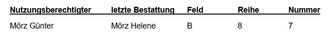 Die Nutzungsberechtigten werden hiermit aufgefordert, mit der der Verbandsgemeinde Edenkoben, Poststraße 23, 67480 Edenkoben, Tel.: 06323 959224, Email: victoria.woerner@vg-edenkoben.de Kontakt aufzunehmen. Sollte der Bitte um Kontaktaufnahme nicht bis spätestens 06. Januar 2024 nachgekommen werden, wird die Grabstätte gemäß der Friedhofssatzung abgeräumt, eingeebnet und bei Ablauf der Ruhezeit neu belegt.