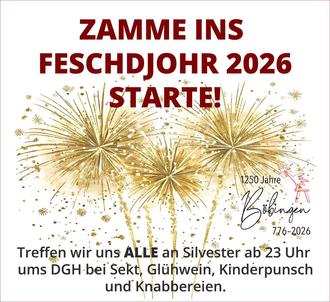 Leider gab es zu wenige Anmeldungen für unser Angebot, den Silvesterabend gemeinsam im DGH zu feiern, aber wir wollen den Countdown ins Jubiläumsjahr „1250 Jahre Böbingen“ gerne mit Euch allen verbringen.