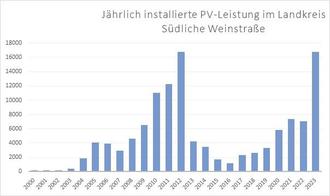 Die Ausbaurate der Photovoltaik (PV) hat sich im Landkreis laut dem Jahresbericht im Vergleich zum Vorjahr mehr als verdoppelt: 1500 Photovoltaikanlagen mit rund 17 Megawattpeak Leistung (17.000 Kilowatt) wurden allein 2023 im Landkreis installiert. Insgesamt erzeugen hier Anlagen mit insgesamt 120.000 Kilowattpeak Leistung rund 110.000.000 Kilowattstunden Sonnenstrom im Jahr – das entspricht dem Stromverbrauch von 30.600 Haushalten und einem rechnerischen Drittel des gesamten Strombedarfs im Landkreis Südliche Weinstraße.
