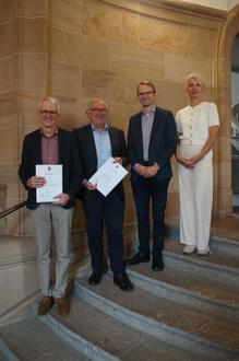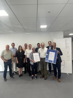 Am 12. August 2025 wird den Verbandsgemeindewerken die Urkunden zur Bestätigung über die erfolgreiche Zertifizierung nach den Vorgaben des „Technische Sicherheitsmanagement (TSM)“ überreicht. Die Prüfer des „Deutschen Verbands des Gas- und Wasserfachs (DVGW)“ und der „Deutsche Vereinigung für Wasserwirtschaft, Abwasser und Abfall e. V. (DWA)“ bewerten das „Technische Sicherheitsmanagement“ der Verbandsgemeindewerke Edenkoben als vorbildlich. Für das Wasserwerk ist das die erste Zertifizierung, das Abwasserwerk erhielt schon einmal, vor fünf Jahren, das Zertifikat. (Bild: Verbandsgemeindeverwaltung Edenkoben)