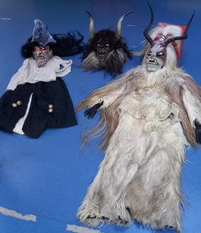 Sie hatten die Maske einer Hexe mit leuchtenden roten Augen, einen Teufel mit Kuhhörnern und einen Krampus dabei. Der Krampus ist ein Brauchtum in z.B. in Österreich. Er ist ein teufelsähnliches Wesen, das den Heiligen Nikolaus begleitet. Der Ganzköperanzug ist von dem Fell einer Langhaarziege, die Hörner sind von einer Antilope und die Haare samt Zopf sind von einem Pferdeschweif.