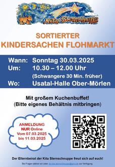 Am Sonntag, den 30.03.2025 findet von 10.30 Uhr bis 12.00 Uhr zum wiederholten Male der sortierte Frühjahrsflohmarkt der Kita Sternschnuppe in der Usatal-Halle statt. Es werden viele Klamotten für den Frühling und Sommer, sowie eine große Auswahl an Spielsachen, Büchern etc. angeboten. Außerdem stellen wir ein reichhaltiges Kuchenbuffett bereit, welches auch gerne von Nicht-Flohmarktbesuchern genutzt werden darf. Einfach ein Behältnis oder Teller mitbringen und durch den Haupteingang der Usatal-Halle zum Kuchenbuffett kommen und mit dem Kauf eines Kuchens die Kita Sternschnuppe unterstützen.
