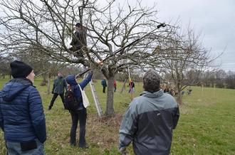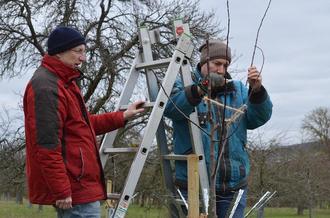 Nach der Mittagspause konnte die Theorie in drei Gruppen unter der Leitung von C. Nadler, R. Scheibel und K. Spieler in die Praxis umgesetzt werden. Ein Schwerpunkt war der Pflanzschnitt, der auf Grundstücken von letztjährigen Baumbestellern geübt wurde. Anschließend wurden auch ältere Bäume geschnitten. Den „Neulingen“ konnte damit eine wertvolle Starthilfe gegeben werden.