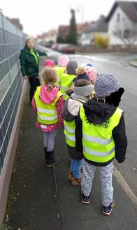 Gemeinsam mit Frau Höhne und einer Erzieherin ging es zum Schulwegtraining auf die „Straße“