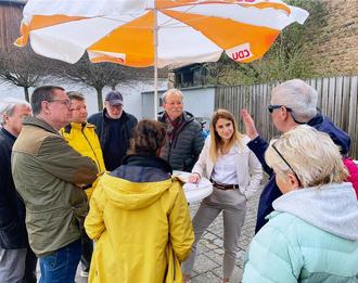 "Ich werde nach meiner Wahl zur Bürgermeisterin wieder neue Dynamik in die Verhandlungen für die Umsetzung der Umgehungsstraße der B 275 bringen," verspricht CDU-Bürgermeisterkandidatin Maria Keller bei ihrem Infostand in der letzten Woche auf dem Platz an der Weed im Ortskern in Ober-Mörlen. Die Problematik des hohen Verkehrsaufkommens insbesondere auch durch LKW gerade an der gefährlichen Engstelle der Straße konnten die zahlreichen Besucher, soweit ihnen die Situation als Betroffene nicht schon bekannt war, hautnah direkt vor Ort erleben. Die massive Verkehrsmenge auf der B 275 bedeutet für die Menschen im dicht bebauten Ortskern mit seinen z.T. historischen Gebäuden eine unzumutbare Belastung. Bedauert wurde, dass es seit der letzten Fortschreibung des Bundesverkehrswegeplans im Jahr 2016 vor etwa 10 Jahren, bei dem die Umgehungsstraße als Zubringer zur Autobahn wieder in den vordringlichen Bedarf genommen wurde, aus dem Rathaus so ruhig geworden war. Umso mehr wurde Maria Keller als selbst Betroffene für ihre erneute Initiative gedankt. Um weiter im vordringlichen Bedarf berücksichtigt zu bleiben, könne jede öffentliche Aktivität zur Befürwortung der Umgehungsstraße bei der bevorstehenden Fortschreibung des Bundesverkehrswegeplans hilfreich sein, erläuterte der Vorsitzende des Bauausschusses Johannes Heil.