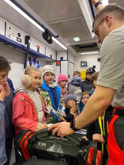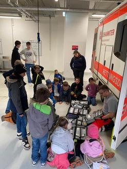 Für die Kinder ging es einmal quer durch die gesamte Rettungswache. In der Fahrzeughalle konnten die Kinder sich alle Fahrzeuge in Ruhe anschauen, darunter auch Rettungswagen und Katastrophenschutzfahrzeuge.