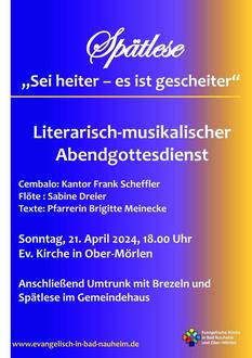 | 18:00 Uhr | Literarisch-musikalischer Abendgottesdienst in Ober-Mörlen |