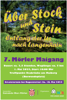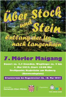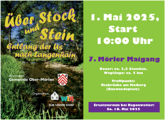 Die Gemeinde Ober-Mörlen als Veranstalter und die organisierende Initiative „Wir für unser Dorf“ freuen sich auf viele interessierte Maigänger. Zu empfehlen sind festes Schuhwerk und, je nach Wetter, ein geeigneter Sonnenschutz. Falls es am Maifeiertag in Strömen regnen sollte, wird der Maigang am Sonntag, 18. Mai, nachgeholt. Im Zweifel kann man sich Gewissheit verschaffen am Veranstaltungstag ab 9 Uhr über die Wetterhotline unter der Mobilnummer 0160-2435992.