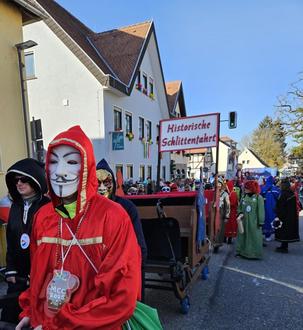 Bestens gelaunt und gestärkt zogen die Fassenachterinnen und Fassenachter nach der Proklamation am Schloss mit mehr als 20 Fußgruppen und 10 Motivwagen durch die bunten Straßen von Mörlau. Auch Traditionsgruppen wie die Dominos und die „Mörler Hexen“ ließen es sich nicht nehmen, als Teil des närrischen Lindwurms die positive Stimmung während des mehr als zwei Stunden andauernden Zuges und die Sonnenstrahlen des Tages aufzusaugen!