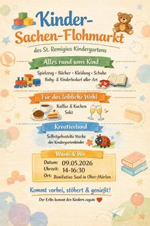 Der Elternbeirat lädt herzlich am 09.05.26, 14:00 bis 16:30 Uhr, in den Bonifatiussaal ein. Familien können gut erhaltene Kleidung, Spielzeug und allerlei Nützliches entdecken. Für eine gemütliche Atmosphäre sorgen Kaffee und selbstgebackener Kuchen. Auch die Kinder haben mit Erwachsenen gebastelt. Der Erlös kommt den Kindern zugute. Wir freuen uns auf viele Besucher und ein paar fröhliche Stunden. Wer noch einen Tisch für seinen Flohmarkt möchte kann sich hier melden: kita-eb@gmx.de. Noch verfügbare Tische werden nach Anfrage vergeben. Wir freuen uns auf euch.