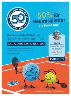 Der Countdown läuft! Morgen, am Samstag, den 27. April, veranstaltet der Ober-Mörler Tennis-Club seinen allseits erwarteten Tag der offenen Tür. Von 15 bis 18 Uhr haben alle Interessierten die Chance, den Club bei lebendigen Aktivitäten kennenzulernen.