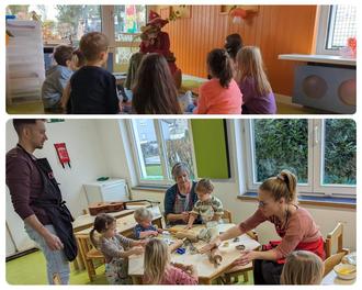 Zum einen gab es kurz vor Beginn der Adventszeit einen märchenhaften Tag in der Kita. Hierzu waren Wilda Wacholder mit ihrer plüschigen Beutelratte Winnipeg zu Gast in der Kita. Wilda ist ein Geschichtenwichtel, der mit seinen Geschichtensteinen zu Kindergruppen reist, um fantasievolle Geschichten zu sammeln und weiterzutragen. Sie hatte handbemalte Steine dabei, die in den kleinen Kindergruppen zu individuellen Geschichten, erzählt von den anwesenden Kindern, gestaltet wurden. So entstanden an diesem Tag mehrere „beste Geschichten der Welt“ nur aus der Fantasie der Kita-Kinder, angeregt durch die gezogenen Geschichtensteine.