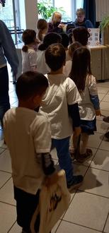 Im Hof, angekommen, wurden die Kinder von Daniela und Corina herzlich begrüßt. Die Kinder wurden in zwei Gruppen aufgeteilt. Die Kinder erfuhren, dass alle Bücher in der Bücherei registriert und gekennzeichnet sind. Möchte man sich ein Buch ausleihen, wird man selber registriert und bekommt ein Lesekonto. Jeder Sterntaler suchte sich ein Buch aus und scannte dies selber auf das „Kita-Konto“ ein. Von der Bücherei erhielten alle Sterntaler einen „Bibfit-Stoff-Rucksack“, um ihr ausgeliehenes Buch geschützt mit nach Hause zu nehmen.