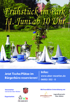 Alles andere (Tischdecken, Geschirr, Speisen, Getränke) bringt jeder selbst mit. Der Fantasie sind keine Grenzen gesetzt. Veranstalter vom Mörler Frühstück im Park ist die Gemeinde, die Organisation liegt in Händen der Initiativgruppe "WIR für unser Dorf". Die Jugendfeuerwehr unterstützt die Veranstaltung tatkräftig. Falls das Wetter am 11. Juni nicht mitspielen sollte, wird das Frühstück im Park eine Woche später am 18. Juni nachgeholt. Reservierungskarten behalten ihre Gültigkeit.