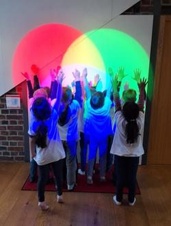 Kinder vor dem „Discolicht“ an der Wand - welche Farbe hat mein Schatten / meine Hand
