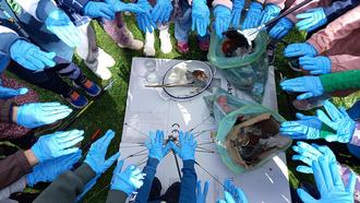 Die Sterntaler ausgestattet mit Greifzangen und Einweghandschuhen beim Müll sammeln