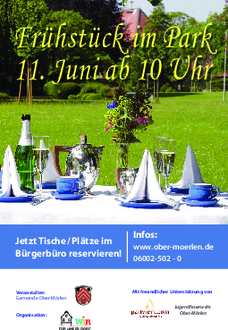 Alles andere - Tischdecken, Geschirr, Speisen, Getränke - bringt jeder selbst mit. Der Fantasie sind keine Grenzen gesetzt. Veranstalter vom Mörler Frühstück im Park ist die Gemeinde, die Organisation liegt in Händen der Initiativgruppe "WIR für unser Dorf". Die Jugendfeuerwehr unterstützt die Veranstaltung tatkräftig. Falls das Wetter am 11. Juni nicht mitspielen sollte, wird das Frühstück im Park eine Woche später am 18. Juni nachgeholt. Reservierungskarten behalten ihre Gültigkeit.
