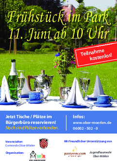 Diesen Sonntag, 11. Juni, kann Ober-Mörlen ab 10 Uhr wieder gemeinsam und generationenübergreifend in seinem schönen Schlosspark frühstücken. Tische und Bänke werden schon stehen, wenn sich jeder sein Tischlein-Deck-Dich zaubert. Damit jeder weiß, wo er seinen Platz findet, sind Einzelplätze oder ganze Tische vorab zu reservieren. Die Reservierungskarten gibt es noch am heutigen Freitag im Bürgerbüro (Schloss) bis 12 Uhr, gerne auch telefonisch unter 50234 (Bärbel Liebert).