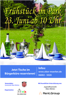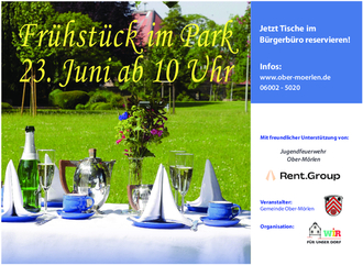 Am Sonntag, 23. Juni, kann Ober-Mörlen zwischen 10 und 14 Uhr wieder in seinem schönen Schlosspark frühstücken. Auch bei der siebten Auflage der Kultveranstaltung werden Tische und Bänke schon stehen, wenn sich Familien, Freunde, Nachbarn, Kollegen, Vereinsgruppen oder einzelne Gäste mit ihren Picknickkörben im Park einfinden und jeder sein eigenes Tischlein-Deck-Dich zaubert. Damit jeder weiß, wo er seinen Platz findet, sind Einzelplätze oder ganze Tische vorab zu reservieren. Die Reservierungskarten gibt es kostenfrei im Bürgerbüro (Schloss) zu dessen Öffnungszeiten (s.u.).