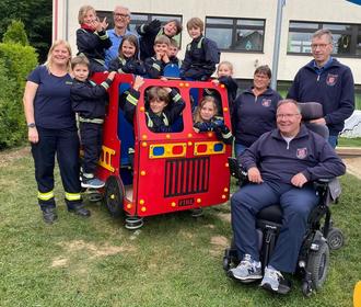 Das brandneue Spielgerät, ein feuerrotes Feuerwehrfahrzeug, hat offiziell seinen Platz in der Gemeinde gefunden und wartet jetzt darauf, von allen Kindern entdeckt und bespielt zu werden.