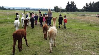 Die Sterntaler erfuhren von Corinna, dass die Alpakas aus Südamerika stammen und 12 - 15 Jahre alt werden. Auf die Frage der Kinder, ob die Tiere auch spucken erklärte Corinna: Ja, Lamas und Alpakas spucken, aber nicht gegen uns Menschen, da sie uns nicht als eine Bedrohung sehen. Die Tiere spucken sich untereinander an, z.B., wenn sie sich streiten - die „Jungs" untereinander, um die „Mädels".