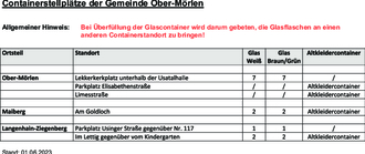 | Allgemeiner Hinweis: | Bei Überfüllung der Glascontainer wird darum gebeten, die Glasflaschen an einen anderen Containerstandort zu bringen! |