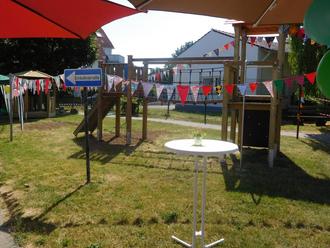 Auf das neue Klettergerüst scheint zwar die Mittagssonne, aber natürlich muss es von den Kindern gleich ausprobiert werden. Bevor sie sich dann mit viel Spaß im Spieleparcours verausgaben, kommen alle zur offiziellen Eröffnung des Sommerfestes im Gebäudeschatten zusammen.