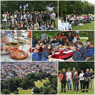 Rückschau (v.o.l. nach u.r.): Der größten Frühstücksgruppe winkt eine Magnum-Flasche Sekt, passenderweise trifft es ein Geburtstagskind | Parkbäume spenden Schatten | Leckerschmecker | Frühstückspause für die fleißigen Helfer der Jugendfeuerwehr | Drohnenfoto von Maik Fritz zeigt die Frühstücksszenerie aus der Vogelperspektive | Bürgermeisterin Kristina Paulenz, „Wir für unser Dorf“ und Helfer von FFW und DRK begrüßen die Gäste im Schlosspark