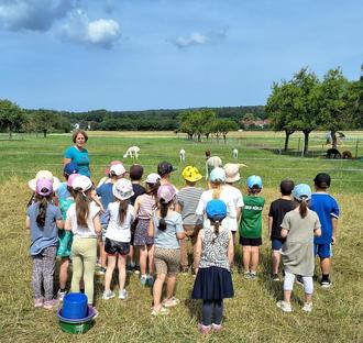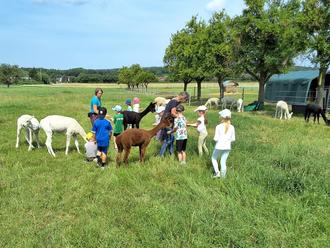 Auf die Frage der Kinder, ob die Tiere auch spucken erklärte Corinna: Ja, Lamas und Alpakas spucken, aber nicht gegen uns Menschen, da sie uns nicht als eine Bedrohung sehen. Die Tiere spucken sich untereinander an, z.B., wenn sie sich streiten - die „Jungs" untereinander, um die „Mädels".