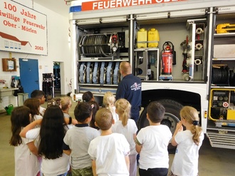 Jetzt wurde es nochmal spannend, Thomas zeigte den Kindern das Staffel-Löschfahrzeug 20/25 und sie durften nach und nach die einzelnen „Rollladen“ an dem Einsatzfahrzeug aufmachen. Auch hier zeigte sich, dass die beiden „Löschtiger“ schon Kenntnisse von den Einsatzgeräten in dem Fahrzeug hatten.