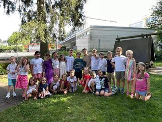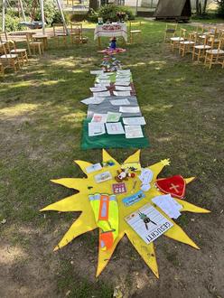 Am 28. Juni fand im Außenbereich der Kath. KiTa St. Remigius zum Abschluss für alle Vorschulkinder nachmittags eine Segensfeier unter schattigen Bäumen statt. Da die „starken Vorschulgeister“ eine sehr große Gruppe von 25 Kindern sind, waren die Sitzplätze halbkreisförmig um den aufgebauten Altar angerichtet, so dass jeder gut sehen konnte. Durch die Feier führten KiTa-Leiterin Martina Petri sowie Pfarrer Roßbach, die von den Vorschul-Betreuerinnen Sabine Adelmann-Troß sowie Paulina Höning unterstützt wurden. Erzieherin Andrea Franke begleitete die Veranstaltung an der Gitarre. Während der sehr schönen und berührenden Feier wurde das letzte KiTa-Jahr der Vorschulkinder reflektiert und das Erlebte durch passende Symbole noch einmal bildlich dargestellt. Es wurde gemeinsam gesungen, Fürbitten für die Schulkinder gesprochen und die Kinder verteilten selbst gebastelte Herzen an die Eltern, auf die diese ihre Wünsche für die Kinder niederschreiben konnten. Die Erzieherinnen hatten für jedes Kind persönliche Worte vorbereitet, die sie auf vorher gestaltete Fußabdrücke der Kinder geschrieben hatten. Diese trugen sie den Kindern nacheinander vor und dabei blieb sowohl bei den Erzieherinnen als auch bei den Eltern kaum ein Auge trocken. Zum Dank an die KiTa und um auch bei den jüngeren Kindern in Erinnerung zu bleiben überreichten die Vorschulkinder eine Laufwippe an den Kindergarten, auf der zuvor alle unterschrieben hatten. Nach einem Gruppenfoto präsentierten die starken Vorschulgeister noch einen extra einstudierten Tanz mit bunten T-Shirts, Kopfschmuck und artistischen Einlagen. Anschließend gab es Würstchen vom Grill sowie kühle Getränke und die Kinder konnten Stockbrot backen.