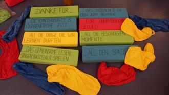 Die Sterntaler und ihre Eltern überreichten der Kita-Leitung eine Leinwand „Wir fliegen weiter“ mit allen Namen der Schulanfänger. Bereits im Dezember hatten die „Sterntalern-Eltern“ große Schaumstoff-Bausteine mit Stoffüberzug überreicht, die seither von allen Kindern mit sehr viel Freude genutzt werden - Die Kita sagt: Herzlichen Dank!