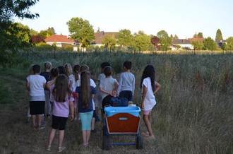 Gegen 18:00 Uhr verabschiedeten sich die Eltern und die Sterntaler blieben mit ihren Erziehern*innen in der Kita. Nach einem gemeinsamen Abendessen gab es noch eine Überraschung. Die Mitarbeiter*innen der Kita hatten den Bollerwagen beladen und es ging an einen tollen Platz an der Usa. Hier wurden die gebastelten Flosse zu Wasser gelassen.