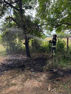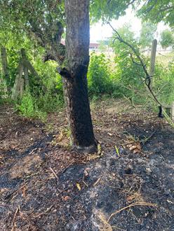 Bei Eintreffen der Einsatzkräfte brannte Gras und Gestrüpp im umliegenden Bereich des Baums. Das Feuer konnte mit der Schnellangriffseinrichtung zügig gelöscht werden.