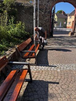 Nachdem die Bänke im Schlosspark bereits gestrichen wurden, waren nun die Bänke vor dem Schloss an der Reihe.